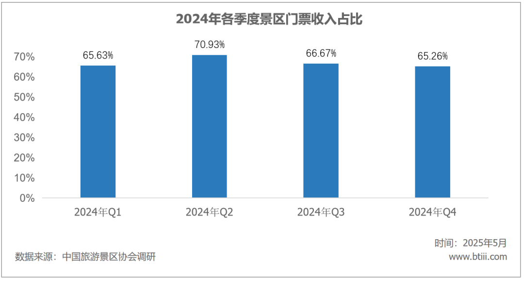 2024年所调研的样本景区中,各季度门票收入占比均超过65%,二季度门票收入占比最高,一度达到70.93%。