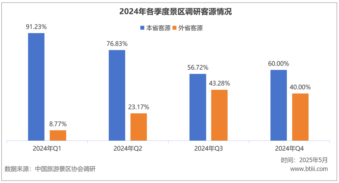 《报告》显示,2024年所调研的所有样本景区,核心客源无一例外都是来自省内,占比最高的一季度省内客源占比甚至高达91.23%,占比最低的三季度省内客源占比也达到56.72%。