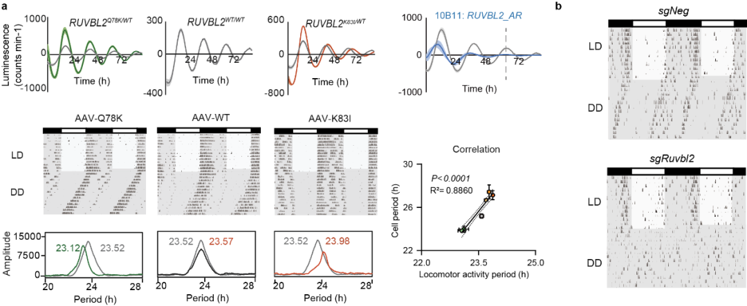 图1 RUVBL2是生物钟的核心组成成分(改编自原文)(a) 在细胞中敲入突变会导致长周期、短周期或无节律的表型,而在小鼠SCN过表达RUVBL2突变体可重现长周期和短周期的节律变化。此外,细胞与小鼠的周期表型呈线性相关。(b) 在小鼠SCN中敲除Ruvbl2会导致其在恒定黑暗条件下丧失活动节律。图源:清华大学生物医学交叉研究院官网