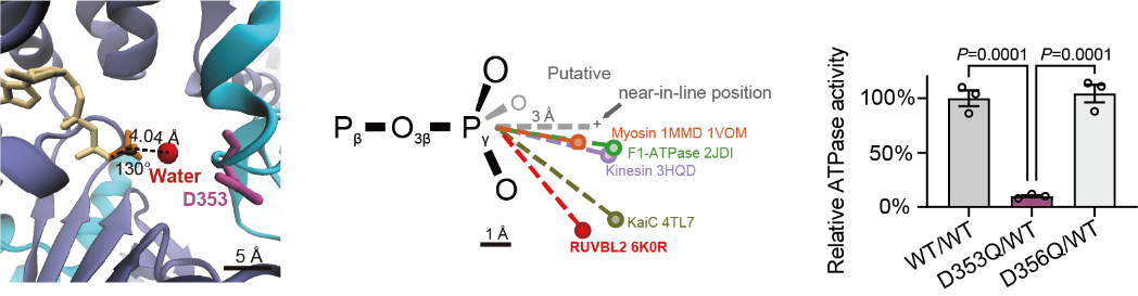 在高分辨率晶体结构中,研究人员观察到了RUVBL蛋白的活性位点有一个特殊的构型:负责水解ATP的水分子,所谓的“裂解水”,被刻意放置在一个“尴尬”的位置。就像一位投手被迫以不自然的角度投球,这个水分子必须从一个不利的角度和距离发动对ATP γ-磷酸的进攻。