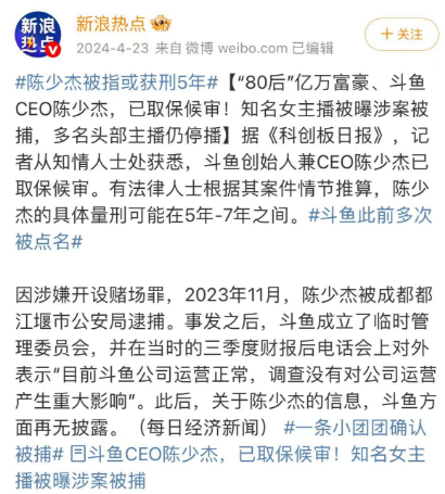 此后,斗鱼CEO陈少杰因为涉嫌开设赌场罪被逮捕,不少斗鱼头部主播暂停直播。