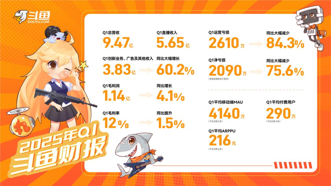 5月20日,斗鱼发布2025年第一季度财报,运营亏损为2610万元,同比大幅减少84.3%;调整后净亏损为2090万元,同比缩窄75.6%,可以看到,亏损在快速收窄。