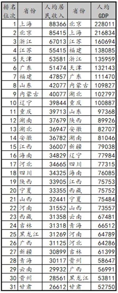 可以看出,像江苏和浙江这样,一省人均GDP高于另一省但人均收入低于另一省的例子,还有不少。有一部分省份,其人均GDP全国排名比其人均收入的全国排名高3位甚至更多,如湖北、新疆、陕西、西藏、云南、青海,但也有一些省份人均收入排名比其人均GDP排名高3位甚至更多,如山东、辽宁、江西、河北、河南、吉林、黑龙江。