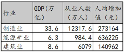 来看2023年全国第二产业三个门类的GDP、从业人数和人均增加值数据。