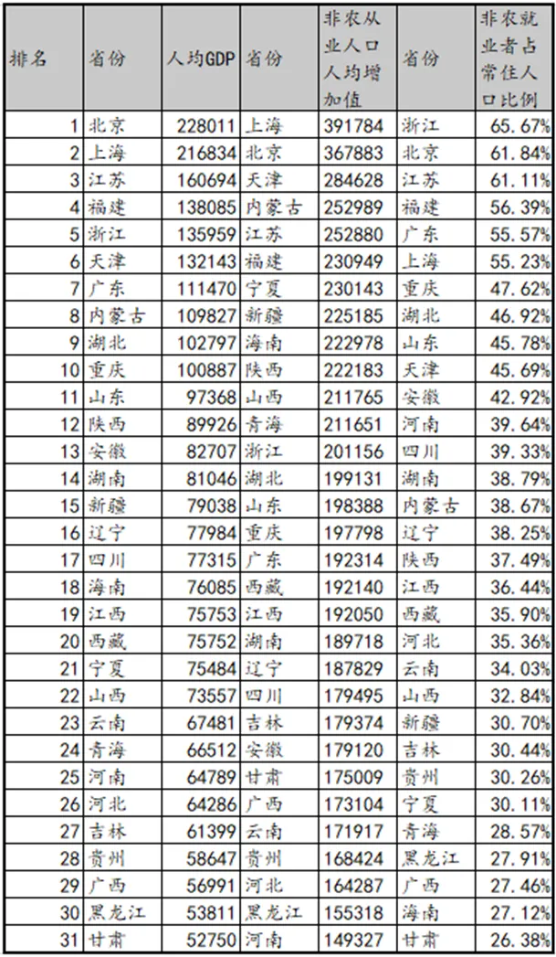 下面是全国各省人均GDP、非农产业从业者人均增加值和非农就业占比一览图。