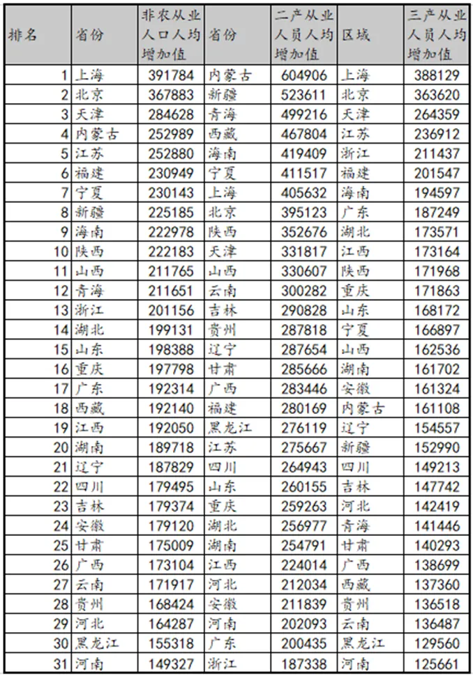 人均三产产值这一列比较简单。第三产业实际上主要包括高端服务业(以白领为主的服务业,如金融、互联网、商务服务等)和生活服务业(以蓝领为主的服务业,零售、餐饮等)。全国各地生活服务业从业者的人效比差距不大,收入差距也不大,所以影响人均三产增加值的主要变量,是不同省份白领在服务业从业人员中的占比,白领占比越高,人均三产增加值就越高,北京、上海的三产从业人员人均增加值明显甩开其他省份,自然很容易理解。