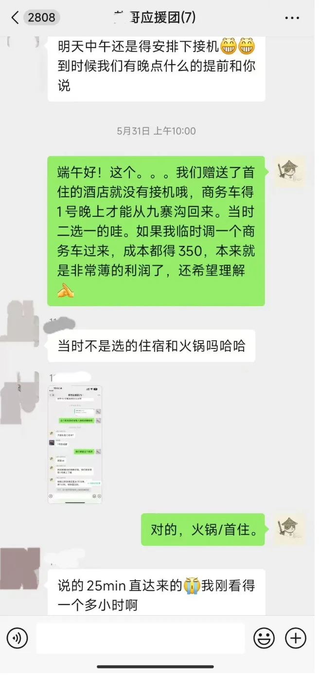 小黄说,“你们首晚赠送的酒店是自己选的呀,我们市区两台车或者一台商务车过来,单边80公里,来回160公里,这个成本在这,真不能免费。”
