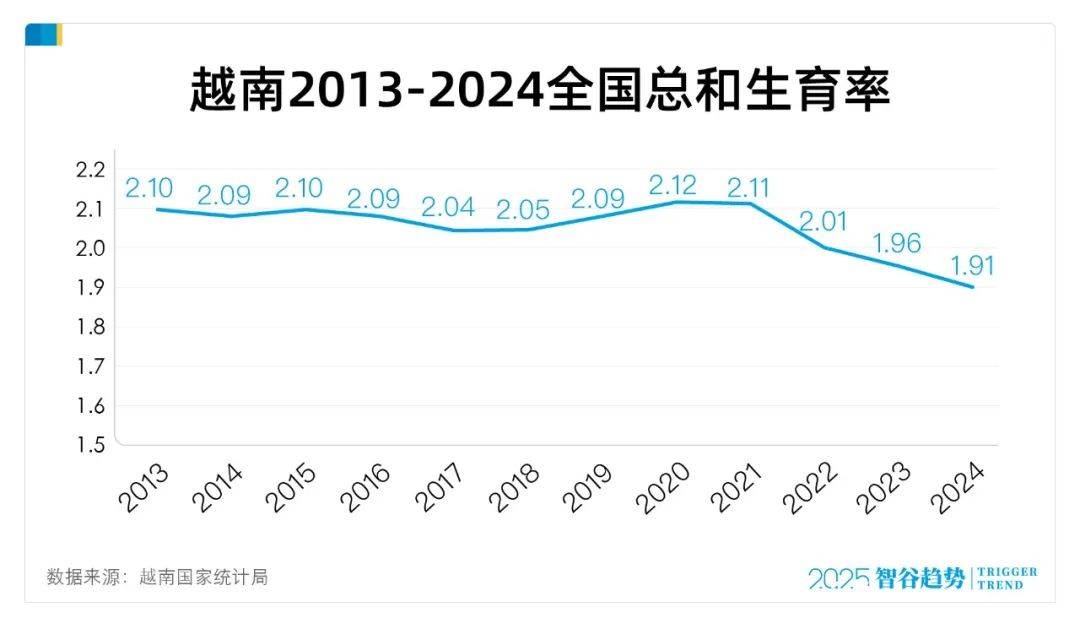 数据显示,1980年代至今,越南总和生育率从4~5下降到1.91,跌破正常人口世代更替率。