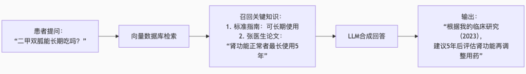 最初使用这个模式的时候,多半是为了加入特殊数据(知识),比如大模型关于糖尿病的治疗输出是基于临床指南的,而我们实现了一个医生的数字分身后,就要用该医生的回答,这里的流程是: