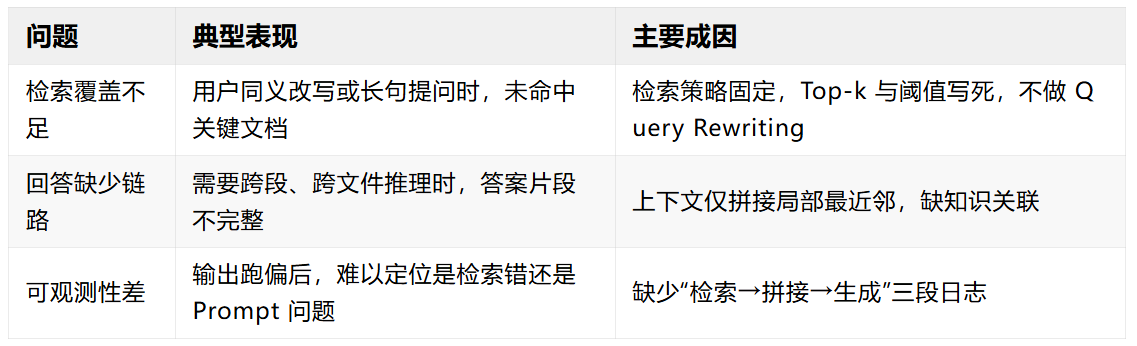 基础RAG优势在于快、易落地;短板则是检索策略死板、推理链条单薄。