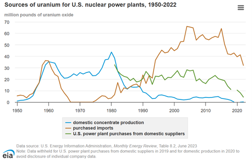 图说:美国商用核反应堆的铀供应来源(1950-2023年) 来源:EIA