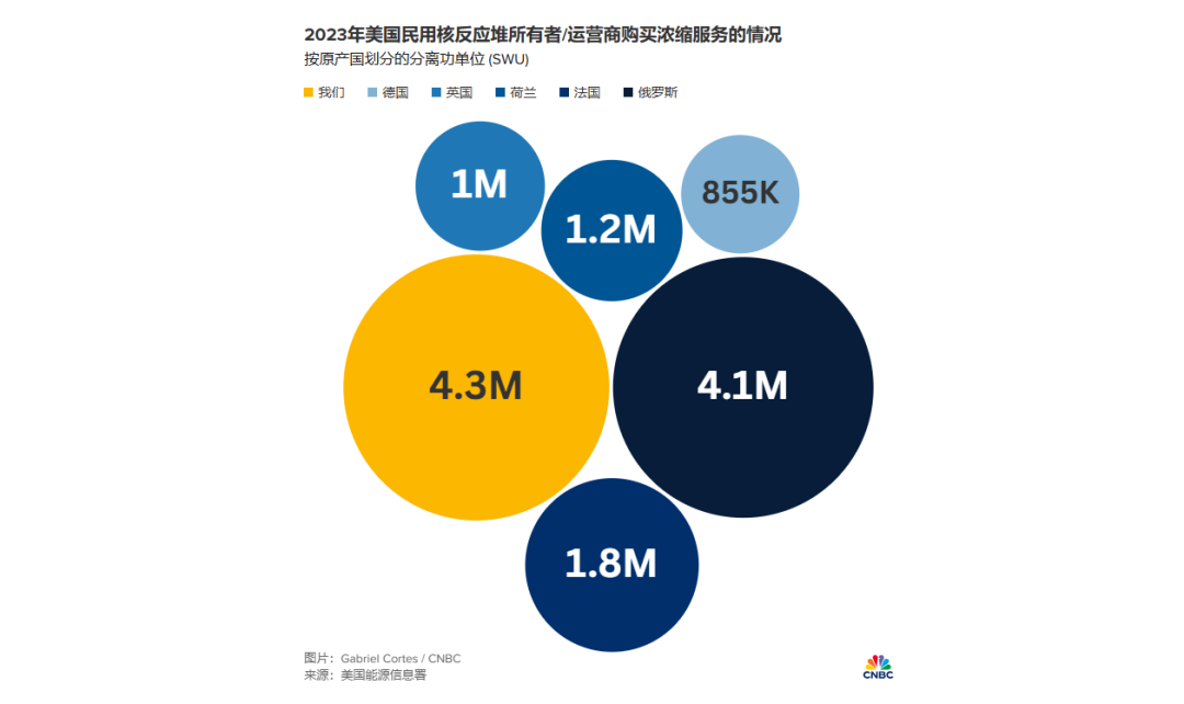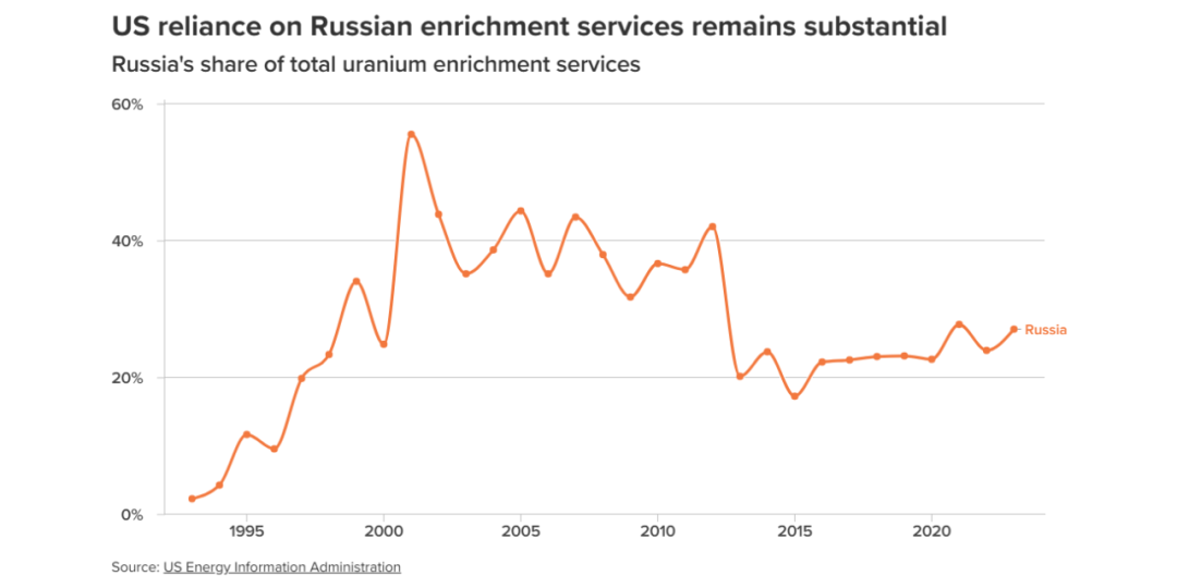 根据世界核协会数据,2023年,美国约27%的浓缩铀采购来自俄罗斯,使其成为美国民用核反应堆最大的单一外国供应商。