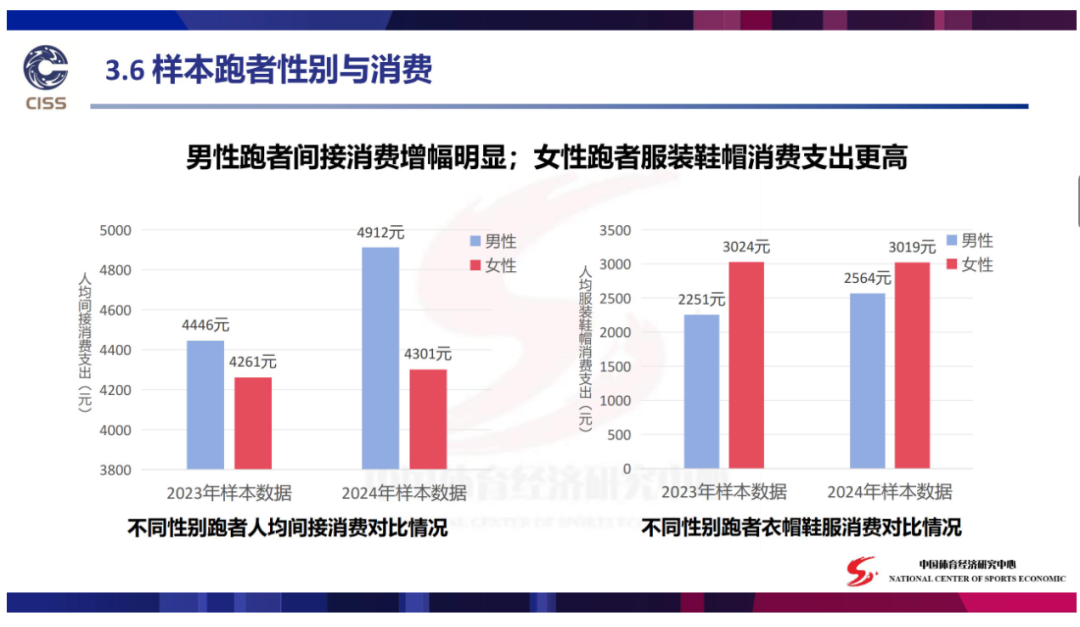 以大众运动跑步为例,在近日国家体育总局体育科学研究所发布的《中国路跑人群消费与赛事经济》中显示,女性跑者在衣帽鞋服上的支出更高,甚至远远超出男性。