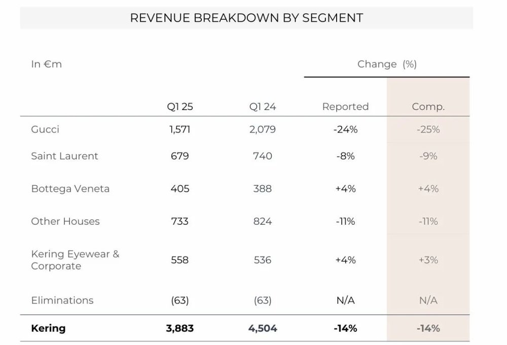 2025年5月,开云集团公布第一季度业绩,销售额下降14%至38亿欧元。其中Gucci收入为15.7亿欧元,同比-25%,比2024年第四季度的-24%更凶险。虽然一些新产品系列获得了关注,但还不足以抵消客流的流失。