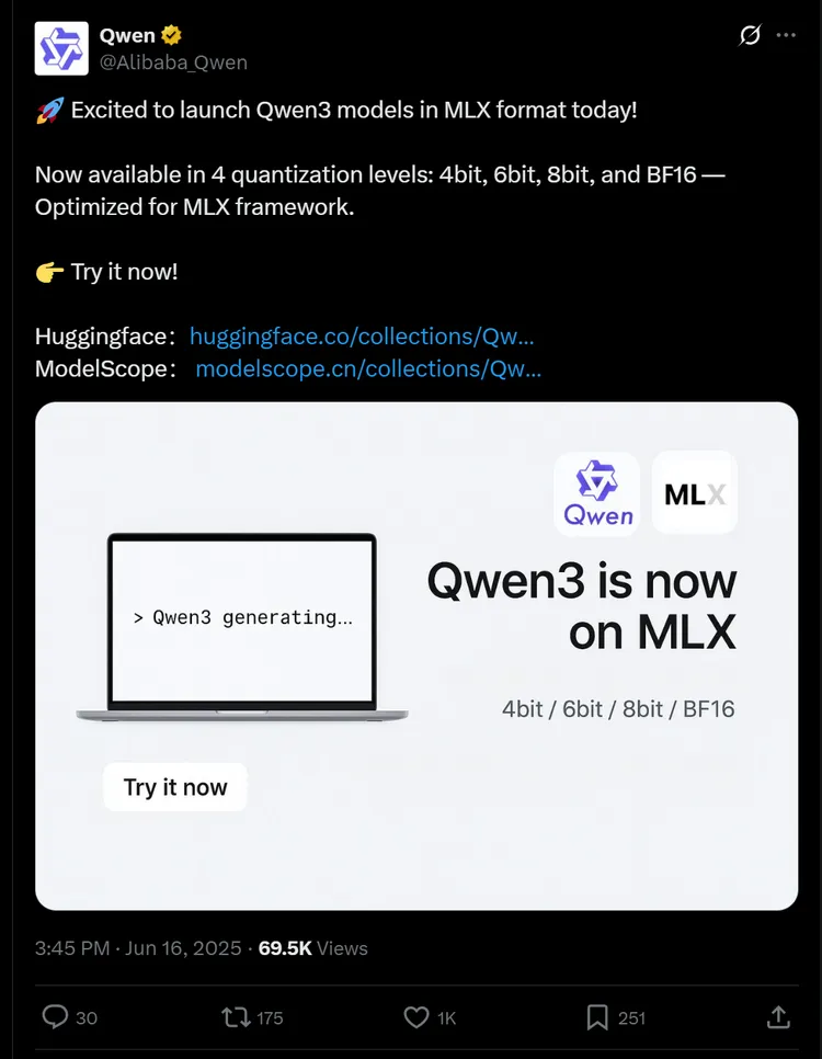 2024年6月16日,阿里巴巴Qwen团队对外宣布,推出支持苹果MLX架构的Qwen3模型,包含4种精度,用户可以根据硬件资源选择合适的模型。搭载对应芯片的苹果设备可以更流畅、更高效地在本地运行这款来自中国的开源大模型。