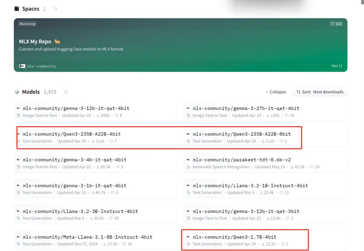 开发者社区已经对此展示出热情。在Qwen官方适配MLX之前,大量苹果开发者早已在社区引导下,自发地在自己的MacBook上部署和测试Qwen模型,且在Huggingface平台上,在所有MLX模型中,排名前五有两个都是Qwen3模型。