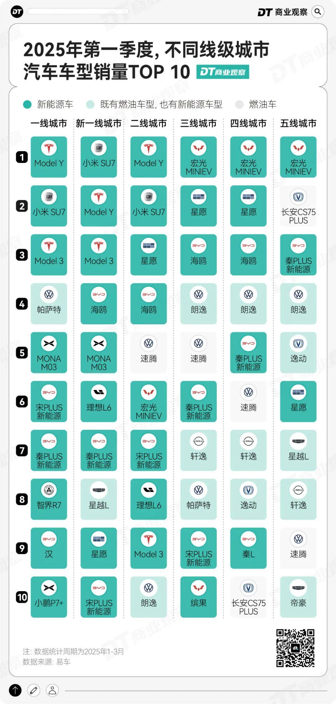 下沉市场的新能源热潮与差异,首先体现在了畅销车型的榜单上。根据易车榜发布的2025年1季度各线城市车型销量排名,不同线级人群对车型的喜爱程度展现出比较大的差异。