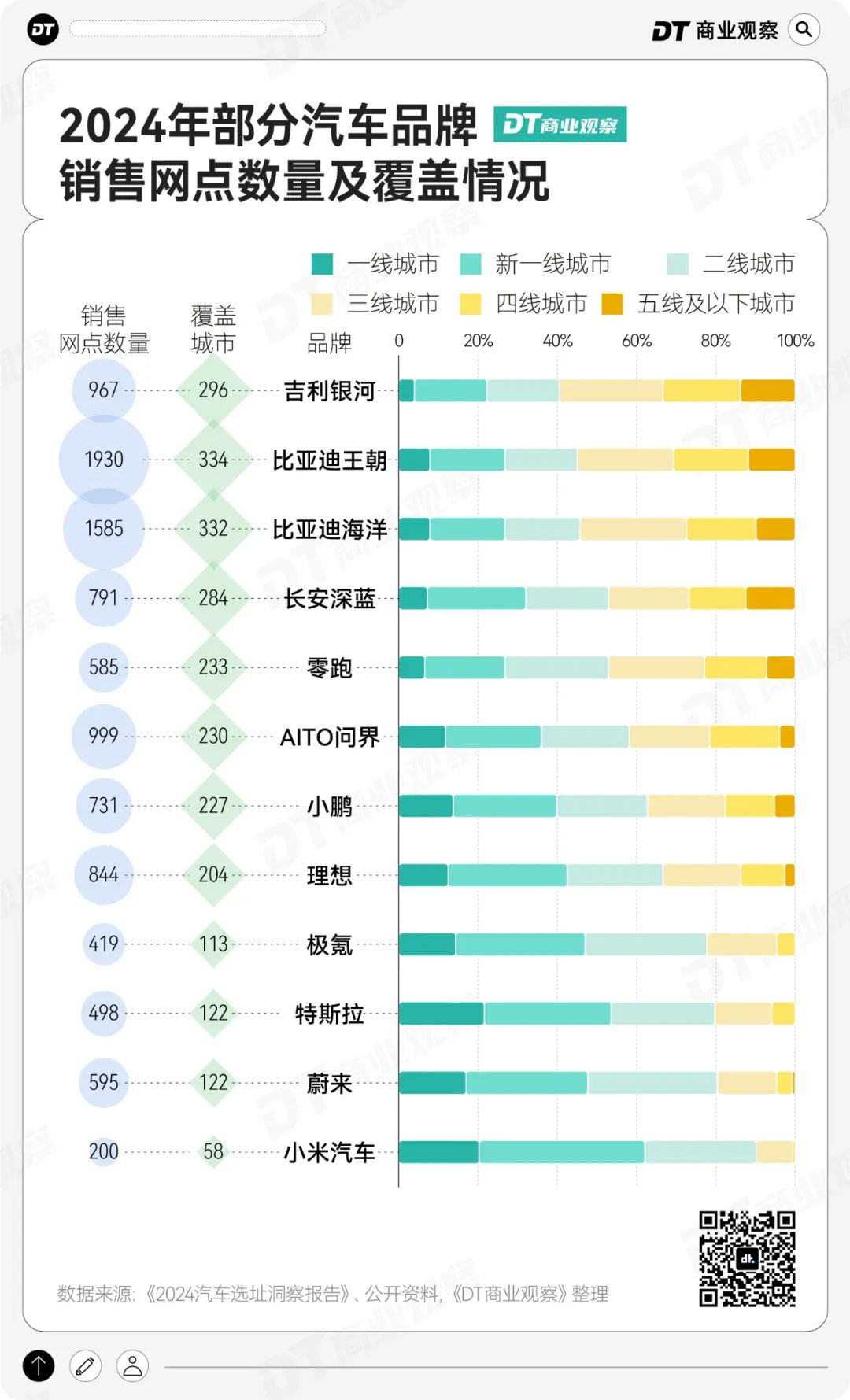 在这场“下乡大战”里,几个国产品牌冲在了前面。吉利银河、比亚迪王朝在三线及以下城市网点占比均超过了50%。