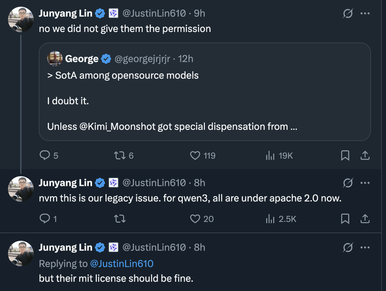 林俊旸的第二条推文揭示了问题的本质,这不是月之暗面的违规使用,而是Qwen团队自身许可策略演进中的“历史遗留问题”。