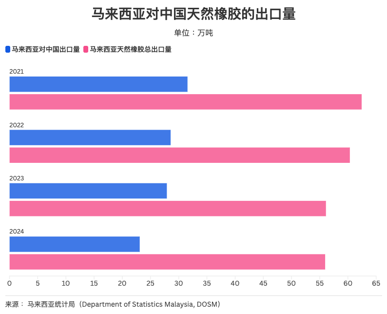 自2021年触及出口高点以来,马来西亚对中国的橡胶出口已连续三年下滑。2024年全年出口额为13.6亿美元,仅为疫情高峰期的一半。