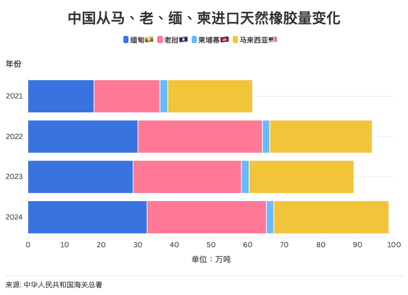 此外,外部竞争的压力也在加剧。近年来,中国正逐步拓展从更多周边国家的橡胶进口渠道,尤其是来自缅甸和老挝的橡胶进口显著上升。数据显示,2021年中国从缅甸和老挝分别进口橡胶18万吨;到2024年,这一数字已分别增长至32.5万吨与32.6万吨,增幅超过80%。相较之下,马来西亚虽然仍保持一定份额,但增长速度明显放缓。这也意味着,在中国橡胶进口结构中,马来西亚的传统主力供应国的地位,正在遭受其他东南亚国家的冲击。
