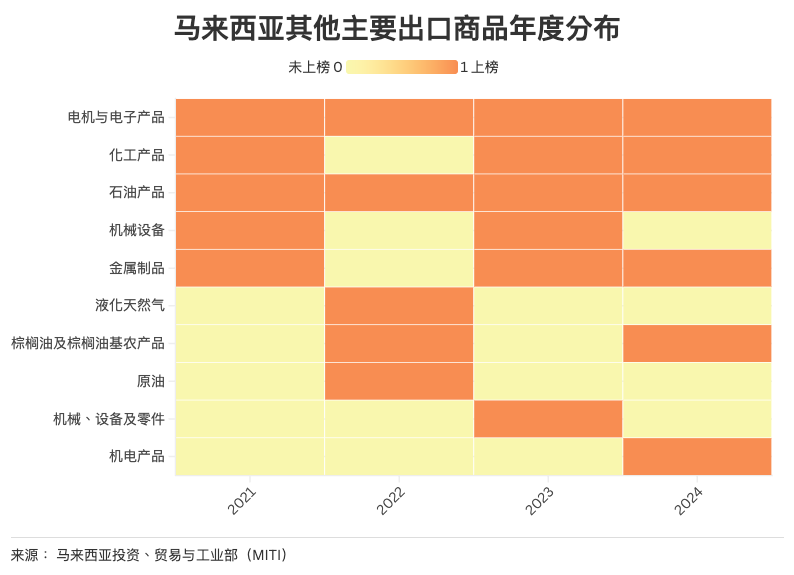 面对传统产业困境,马来西亚也在加快出口结构调整,谋求产业多元化。从图表中可以看出,电机与电子产品在过去四年成为出口增长的新引擎。这反映出马国在电子制造、半导体及数字经济方面的政策推动已初见成效。同时,化工和石油产品也保持较强的竞争力,而液化天然气、有机农产品与热带水果等新兴品类也逐步进入出口榜单。