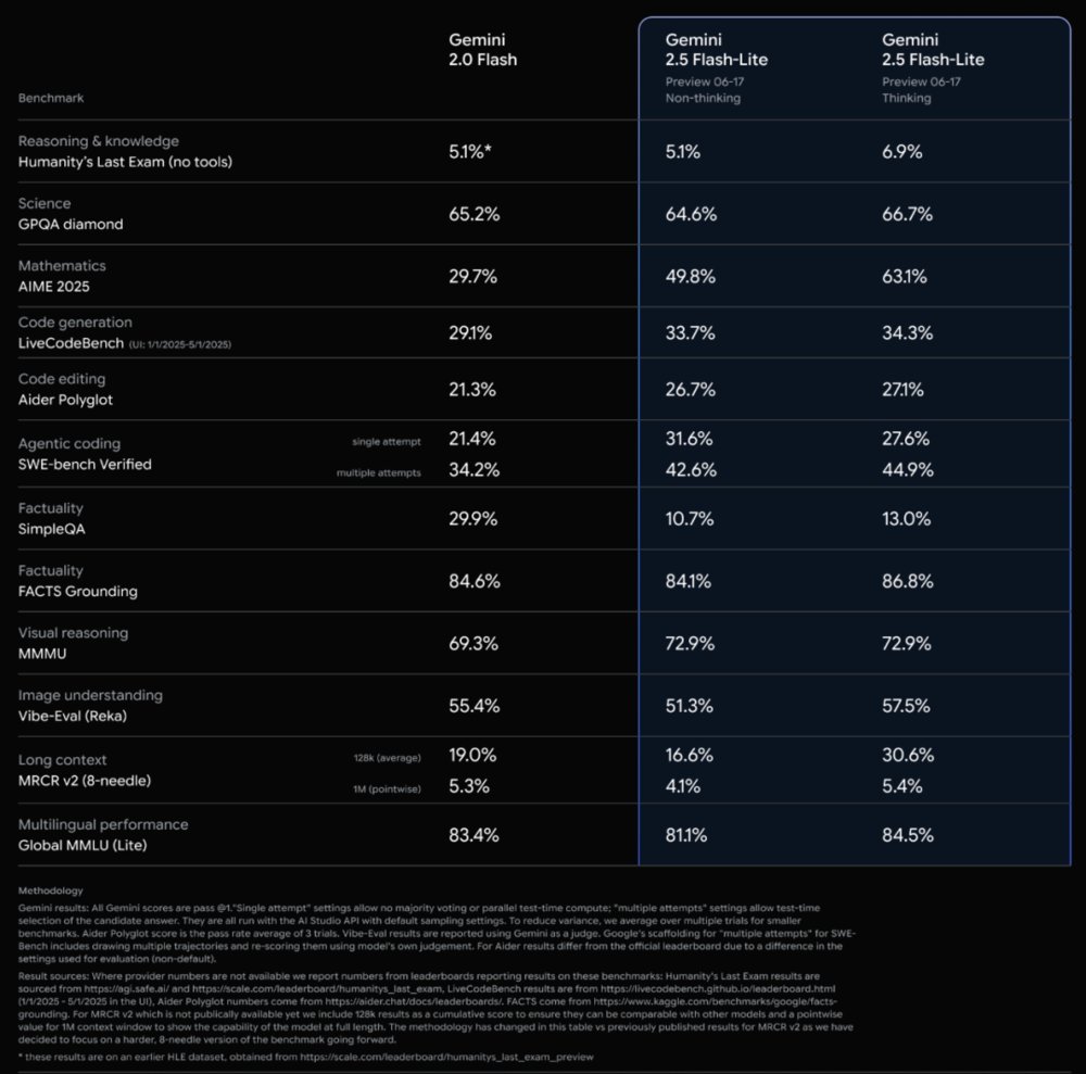 Gemini 2.5 Flash Lite在编程、数学、科学、推理和多模态基准测试中全面超越2.0 Flash-Lite,广泛任务延迟低于2.0 Flash-Lite和2.0 Flash。谷歌称这一模型为其最经济实惠、速度最快的2.5系列模型。
