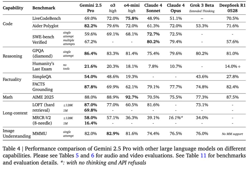 不过,在数学方面,Gemini 2.5 Pro的表现略逊色于OpenAI o4-mini,图像理解方面分数略低于OpenAI-o3 high。