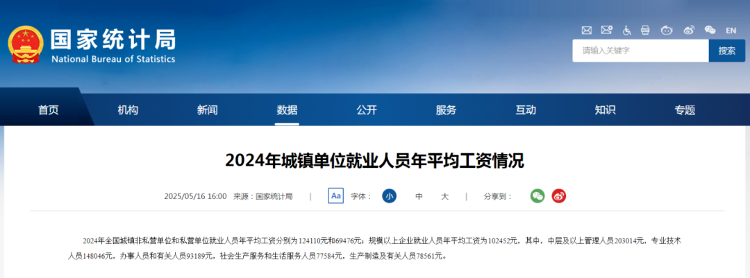 据国家统计局数据,2024年全国城镇非私营单位和私营单位就业人员年平均工资分别为124110元和69476元。规模以上企业就业人员年平均工资为102452元,其中,中层及以上管理人员203014元,专业技术人员148046元,办事人员和有关人员93189元。