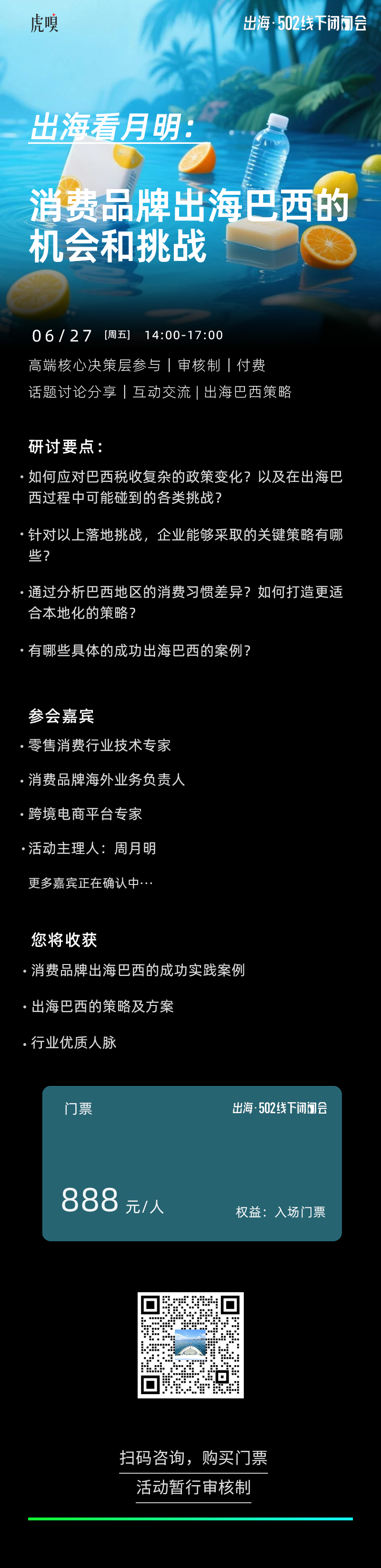 6月27日,在深圳,我们将举办出海·502线下闭门会。特邀深耕巴西市场的先行者与专家,分享消费品牌成功出海巴西背后的秘密,通过实践案例与线下面对面交流,以期为出海巴西的从业者指明方向。