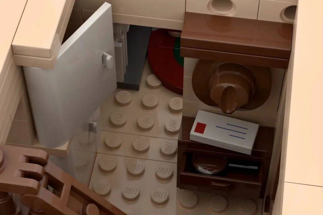 模型是建在32x32的螺柱底板上的,周围用白色栅栏围起来,两侧有着科技销连接口,这样你可以很容易地将这个小庄园和其他街景建筑连起来。花园并没有什么可看的,所以让我们直接来看屋子内部吧。