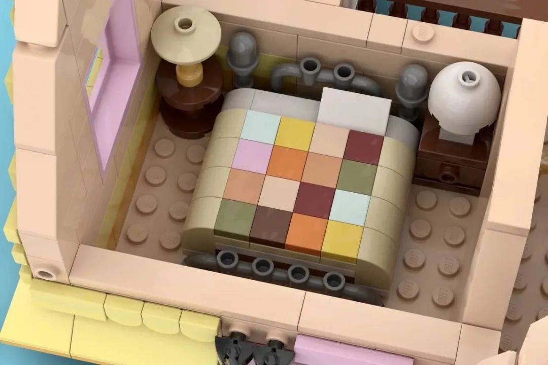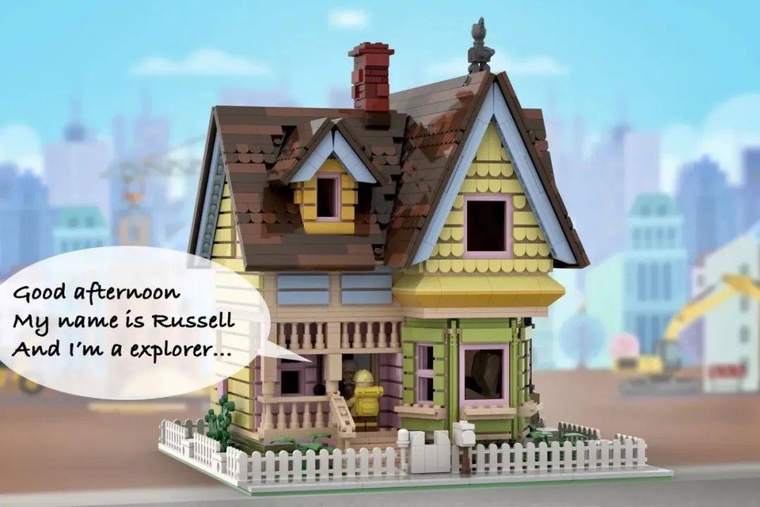 Yang Yang以皮克斯动画电影《飞屋环游记》中的屋子为原型,用2988件零件创造了这个五彩缤纷的住宅。模型中有两个人仔,分别是剧中的两位主角:老卡尔·弗雷德里克森和年轻的“荒野探险家”,8岁的小男孩罗素。此外,会说话的狗狗道格和天堂瀑布鸟凯文也以砖块的形式出现在了这里。
