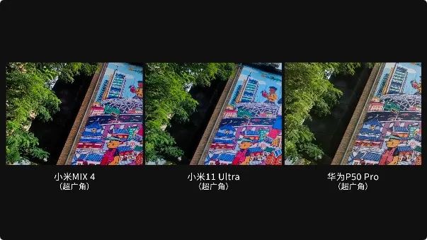 先来看日间场景,在这一组样张中,小米MIX 4照片色调偏蓝,观感上不如华为和11 Ultra,华为色彩还原更偏向肉眼所见,小米11 Ultra则偏向客观准确。