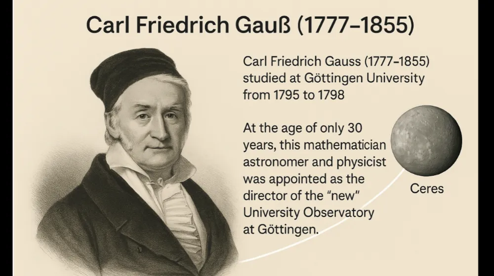 1795年,18岁的高斯来到哥廷根学习数学与自然科学,4年后获得了赫尔姆施泰特大学的博士学位。在博士论文中,高斯首次给出了代数基本定理的严谨证明。1801年,高斯出版了《算术研究》(Disquisitiones Arithmeticae),系统奠定了数论的基础,标志着数论作为一门独立学科的诞生。同年,他又用最小二乘法成功地预测出小行星——谷神星的位置。1807年,高斯出任哥廷根大学的天文学教授并负责建设哥廷根天文台,他随后主持了汉诺威王国的大地测量,并开展了地磁学、力学、物理学的实验与理论研究,又在此过程中奠定了非欧几何的基础,发展了微分几何与位势理论等众多数学分支。
