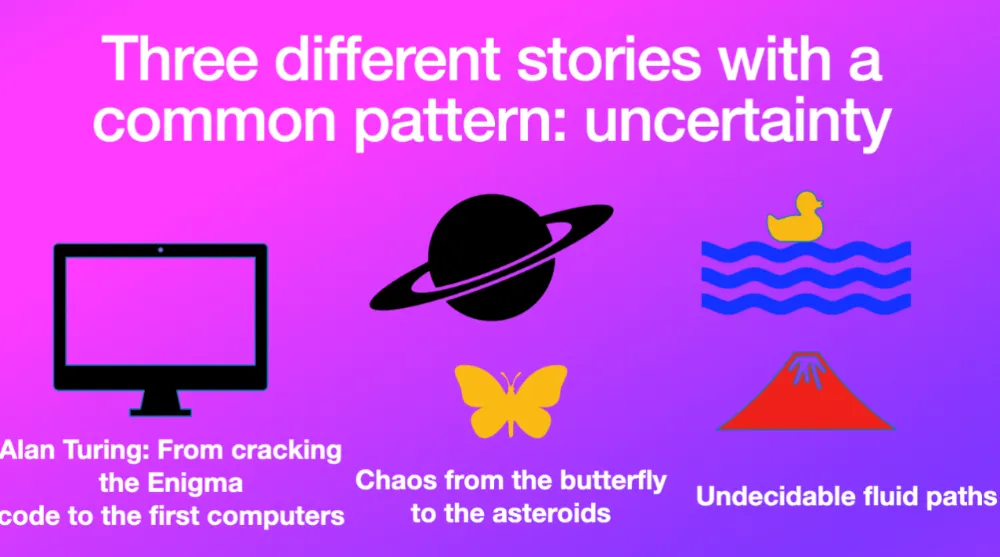 英国数学家图灵在1936年创造性地证明,如果一个系统能够被看作是一台图灵机,那么停机问题就是不可判定的。Eva应用图灵的结论,论证了预测流体系统中粒子的长期行为在计算上不可判定。也就是说,在小黄鸭漂流记的故事里,由于小黄鸭漂流在一个复杂的洋流中,即使我们知道小黄鸭的初始位置与洋流规律,但如果你问它最终是否会漂到某个岛屿,答案是——永远不知道,因为解的长期行为在计算上是不可判定的。