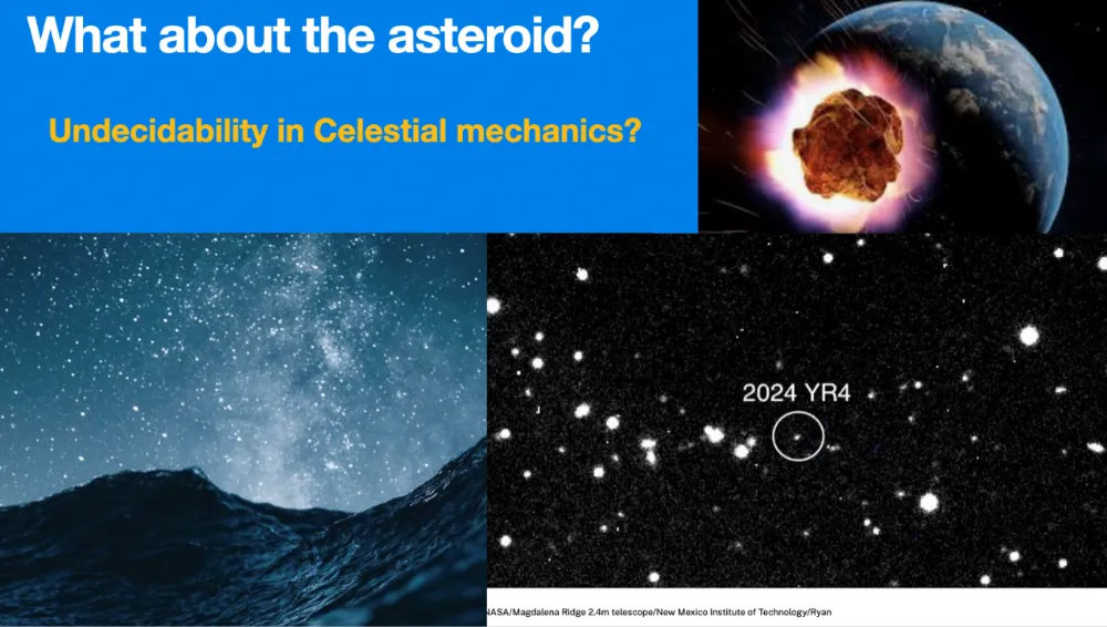 在哥廷根担任高斯讲座讲授期间,Eva将致力于解决新的问题。由于洋流运动可以与天体运动相对应,表明相同的几何原理支配着流体力学与天体力学,辛几何与切触几何将在其中起到关键作用。比如要预测Y4R卫星是否会落到我们头上,所有的计算都依赖于辛几何。再比如著名科幻作家刘慈欣的著名小说《三体》,其基本设定便来自于经典力学中的三体问题。假设三体是太阳、木星和火星,要想准确预测火星的运动非常困难,因为这个系统是不可积的,无法用简单的公式或解来描述。所以美国国家航空航天局(NASA)与(中国)国家航天局(CNSA)在进行轨道计算时,会避免直接求解三体方程,而是采用其他模型。那么类似于小黄鸭的漂流,三体问题的运动在算法上是否也是不可判定的?