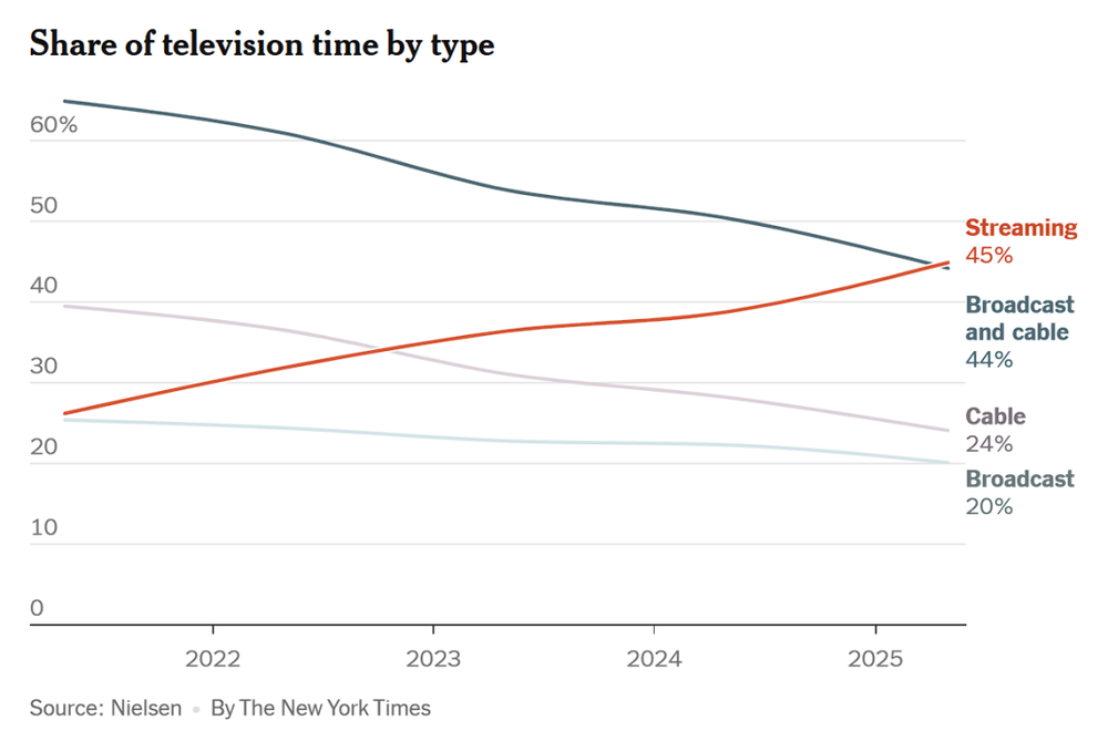 流媒体的未来已至,并且正成为现实。根据尼尔森周二发布的报告,2025年5月,美国人通过流媒体服务观看电视的时长,首次在一个完整的月份里,超过了有线电视和广播电视的总和。