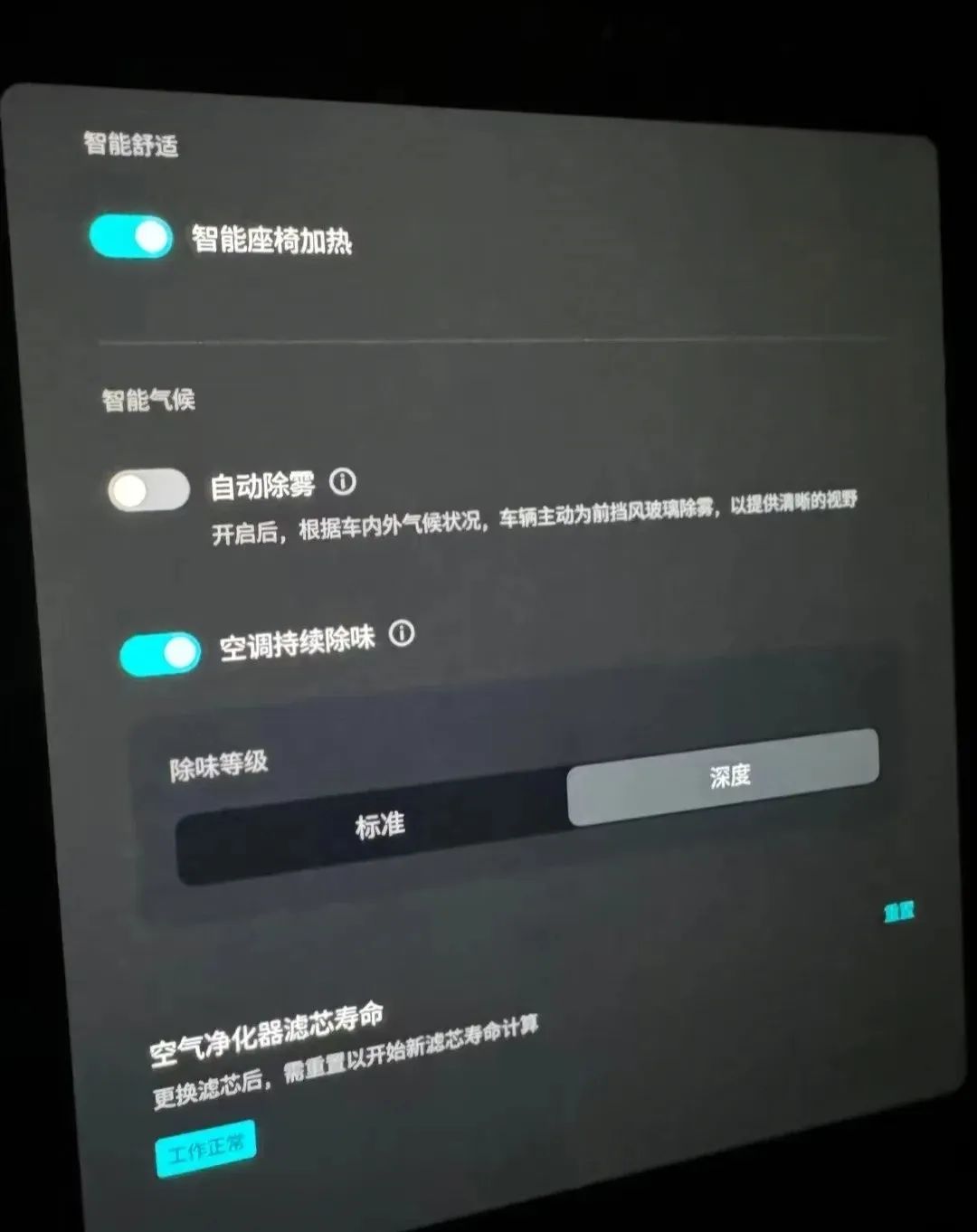 比如,蔚来推出了超强干燥模式,用通风模式、外循环、8档吹风等叠加的buff,让空调箱和滤芯保持干燥。