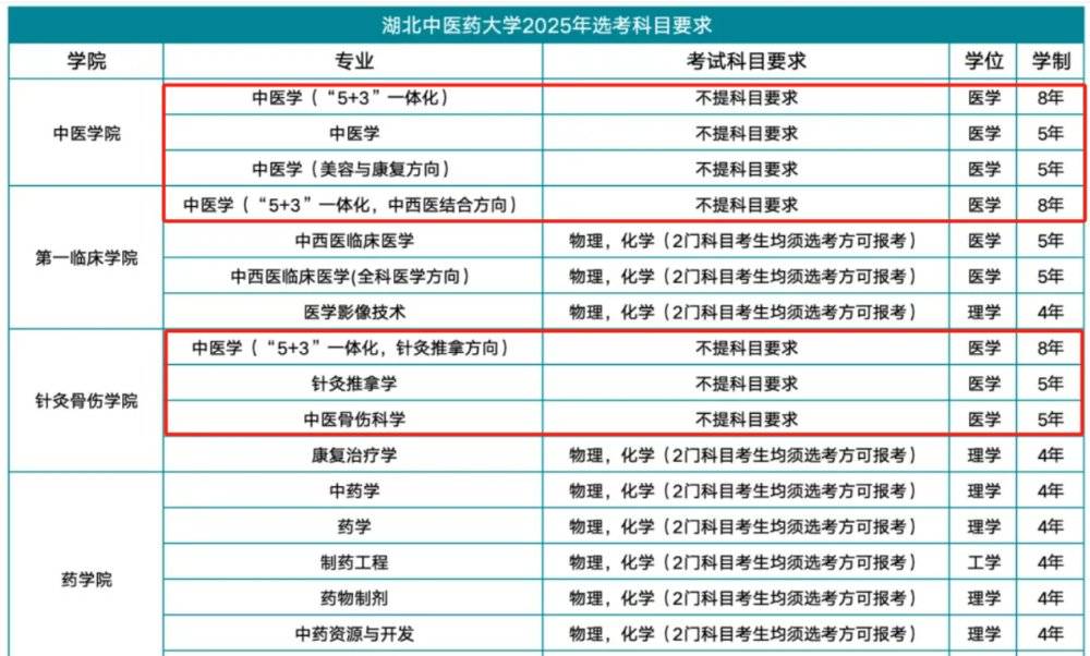 此外,湖北中医药大学的5年制中医学、针灸推拿学、中医骨伤科学等专业,8年制的中医学(“5+3”一体化,含中西医结合方向、针灸推拿方向)等,都将首选和再选科目调整为“不提科目要求”。