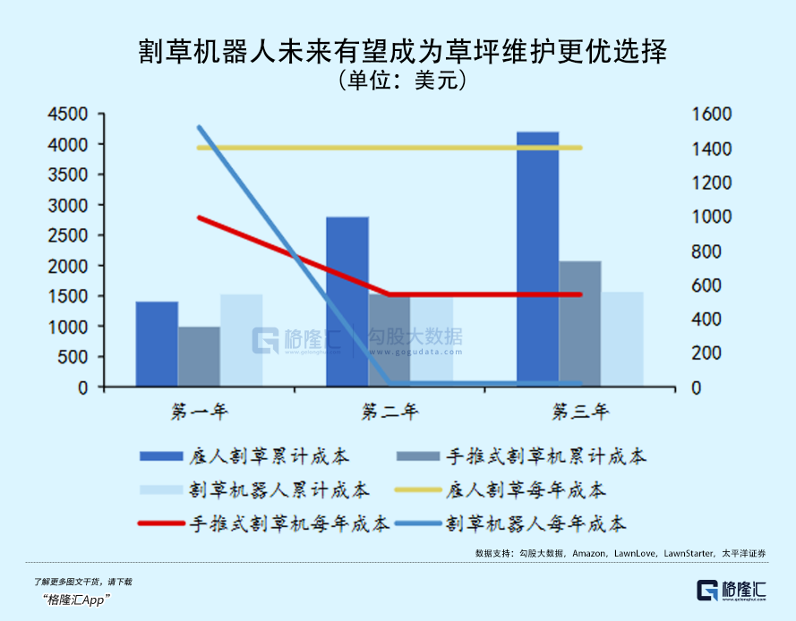 一款高端割草机器人的价格大约在2000~5000美元左右,初期购置成本虽然比较高,但按照5~6年的使用周期来看,节省了一大笔费用。