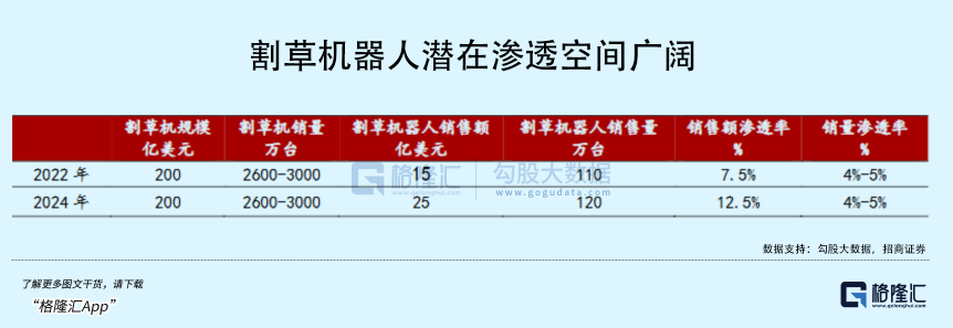 根据机构数据,在割草机市场中,当下割草机器人行业规模达到了25亿美元,销售额渗透率仅12.5%,销量渗透率约为4%~5%。