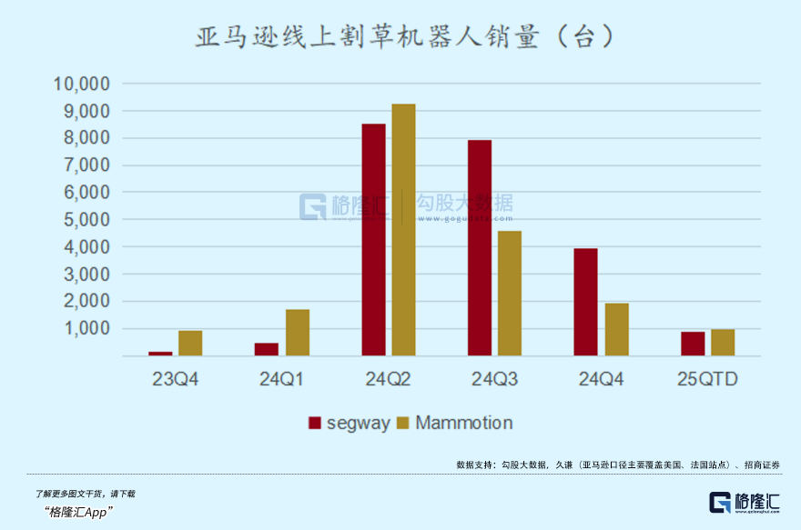 但区别于扫地机器人,出于安装使用和售后服务需求,割草机器人的销售渠道更多以线下为主,而线下渠道则被富世华等传统品牌牢牢把控。而线上销售占比仅20%~30%,在亚马逊等电商平台上,九号(旗下Segway)和松灵(旗下Mammotion)份额领先。