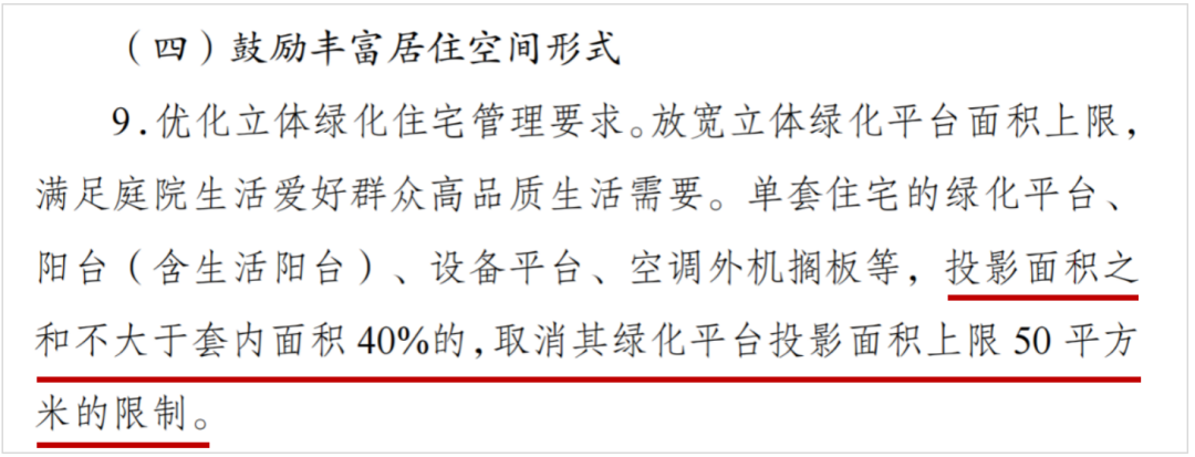 “单套住宅绿化平台、阳台等投影面积之和不大于套内面积40%的,取消其绿化平台投影面积上限50平米的限制。”