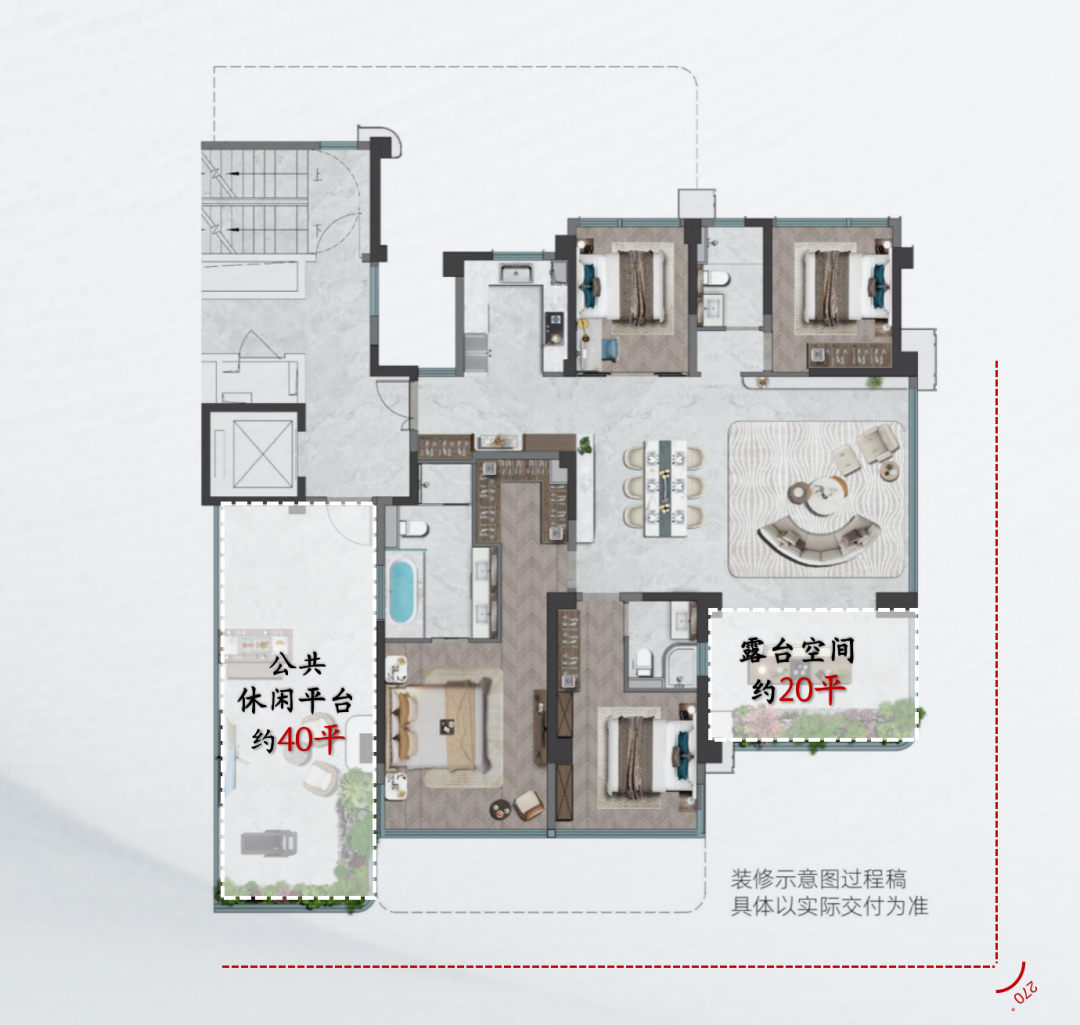 这也意味着一套套内250平的房子,现在露台赠送面积最高可达100平(视具体情况而定),比之前期50平露台空间的上限翻了一倍。