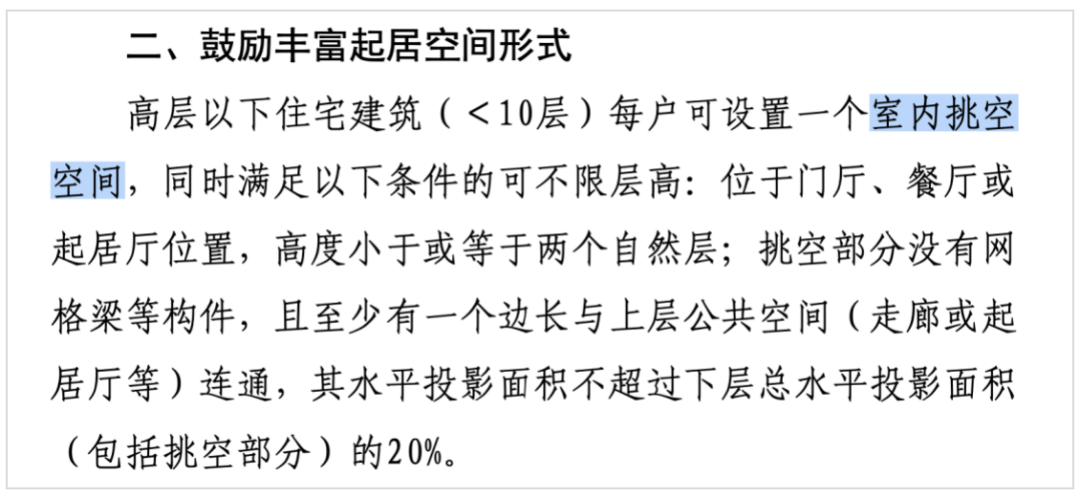 并且同样鼓励10层以下的住宅,每户可设置一个不超过套内20%的室内挑空空间。