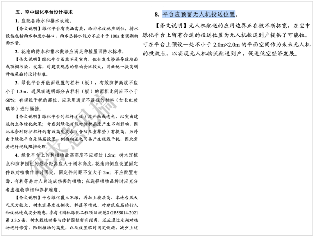 平台应预留一个不小于2.0m×2.0m的平面空间,作为未来无人机投送位置,以实现无人机物流配送到户。