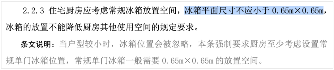 强制要求厨房至少考虑设置常规单门冰箱位置,一般需要0.65x0.65m的放置空间。