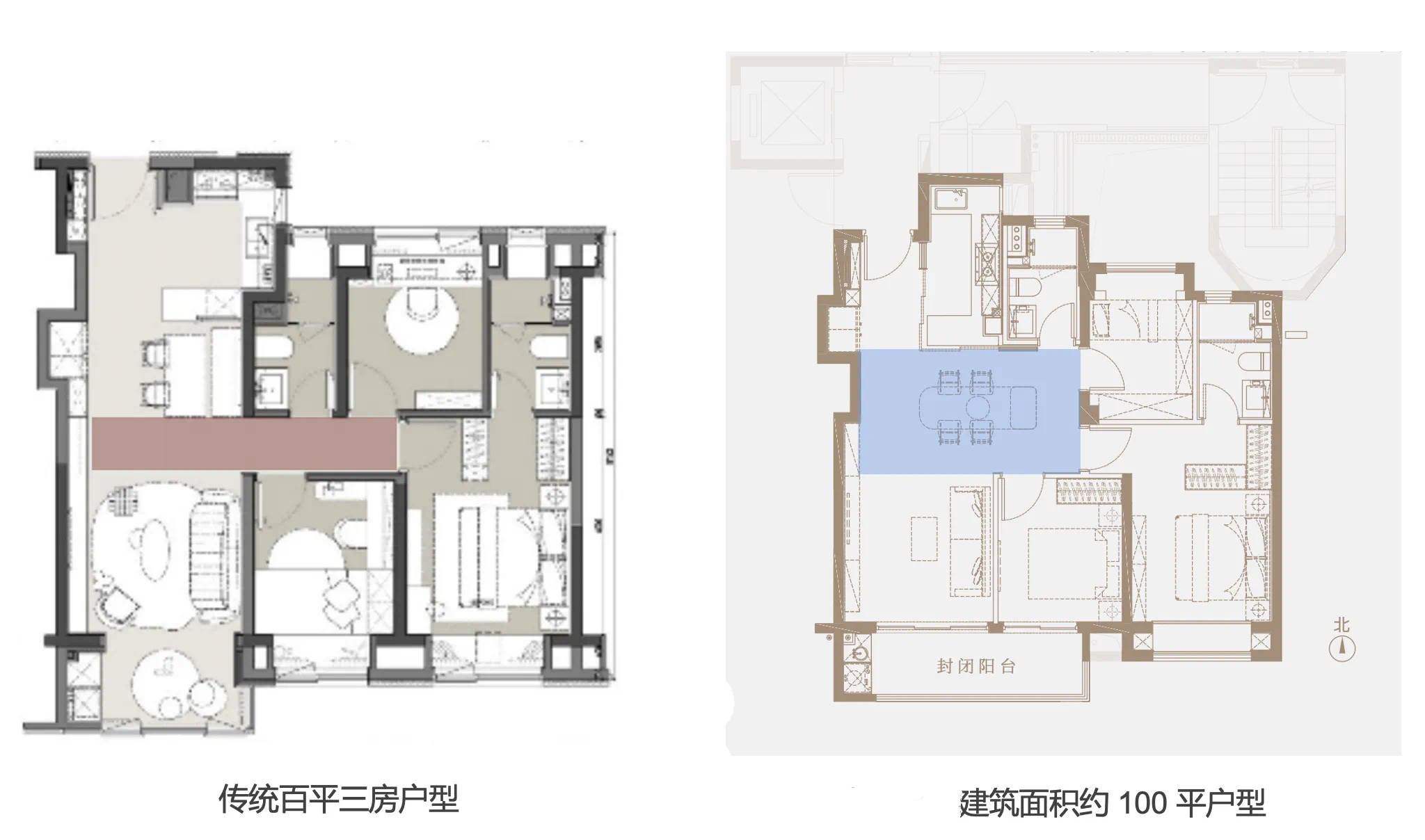 这是上海某项目的100平户型和传统三房相比,在厨房、餐厅、公卫之间稍稍调整了位置,就使得原本公共卫生间的承重墙往后移动了。