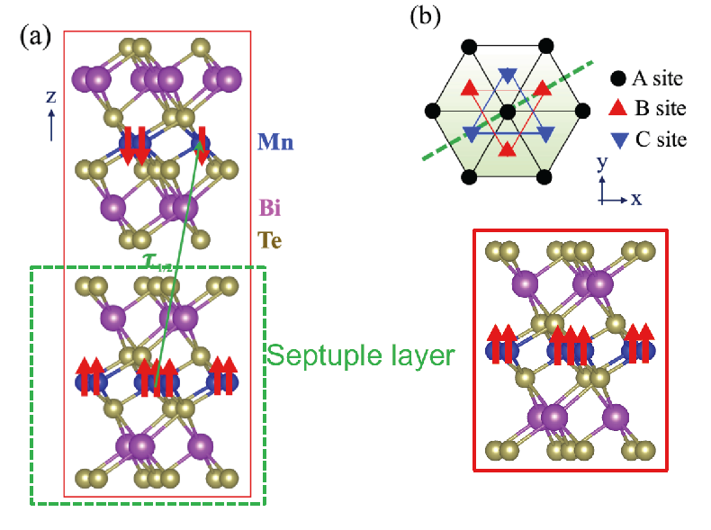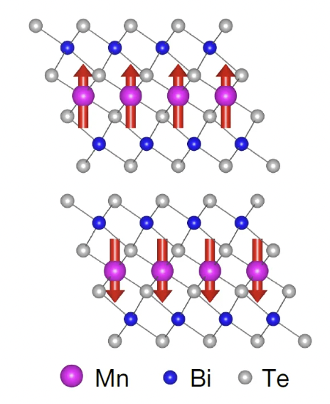 这种材料有没有呢?早在2019年,中国的理论物理学家就预言了轴子绝缘体材料MnBi2Te4。它是一种具有层状结构的准二维材料,每个单层里含7层原子且呈现铁磁性,相邻单层之间则是磁矩相反的反铁磁性。