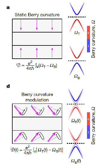 一直到2025年4月16日,相关的实验结果才在著名学术期刊Nature上发表。实验结果清晰地展示了θ角,也就是材料中磁电耦合系数,以约44GHz频率进行周期性振荡,振荡幅度甚至达到静态值的12%。科学家们认为,这种磁电耦合系数的振荡来自于材料内部贝里曲率的偶极矩调制,也就是和材料电子态的整体拓扑属性密切相关。